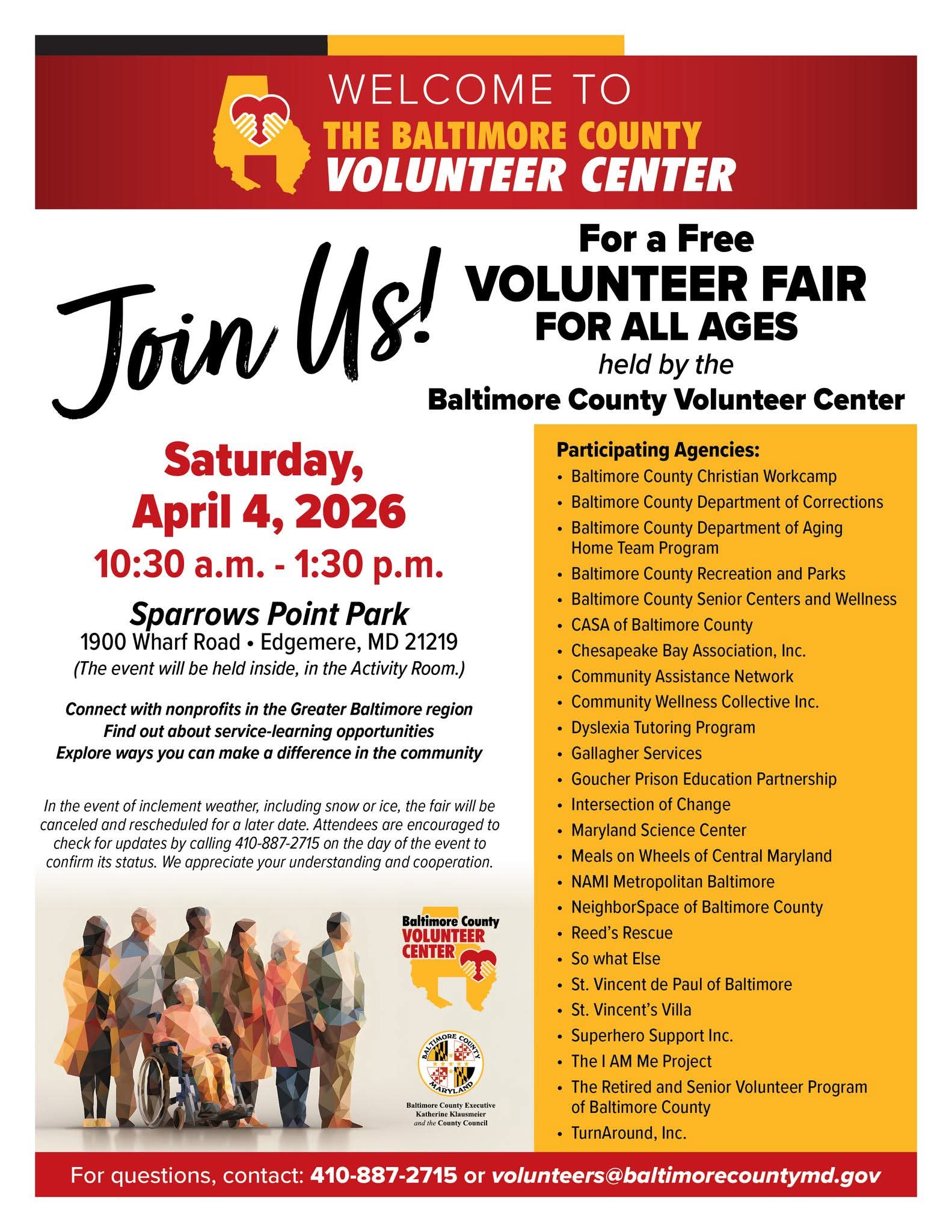A Volunteer Fair will be held in Sparrows Point for all ages on Saturday, April 4 from 10:30 to 1:30 p.m. This event will be held inside at the activity center at Sparrows Point Park. The event will bring together nonprofits and government agencies to connect with individuals and families who are eager to get … Read more