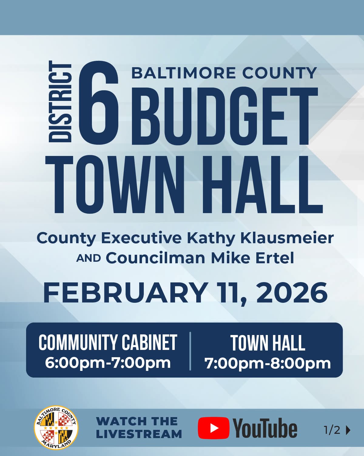 Councilman Mike Ertel reminds constituents that the District 6 Budget Town Hall is scheduled for tomorrow night, Feb. 11, from 6- 8 p.m. at Parkville High School.