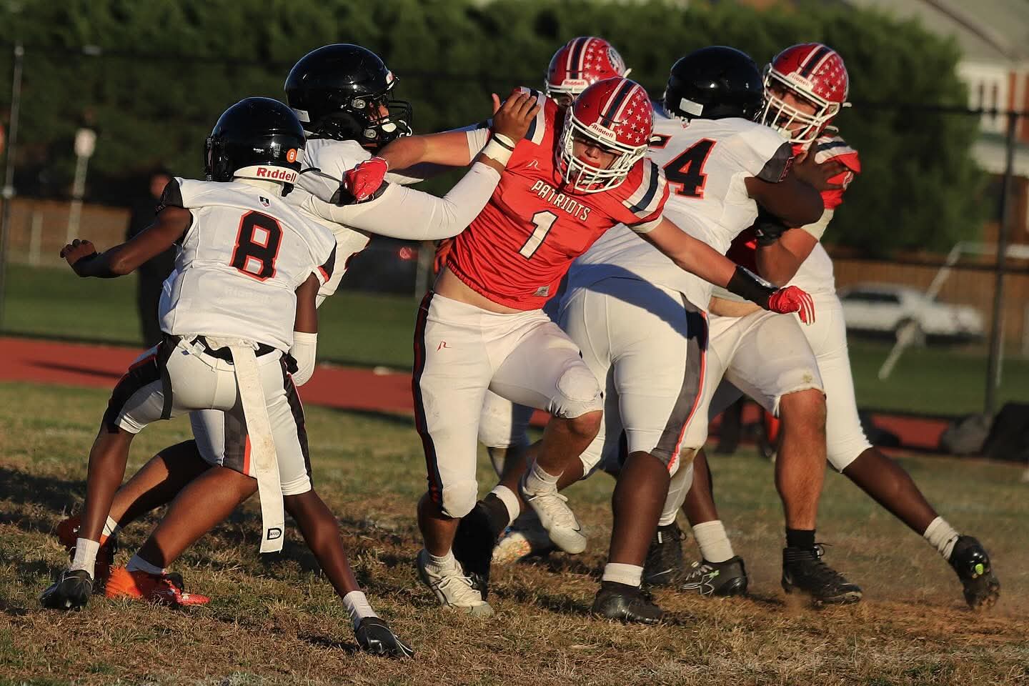 City’s defense was all over Patriot quarterback Wyatt Perry.–photo courtesy of Rick Currier-