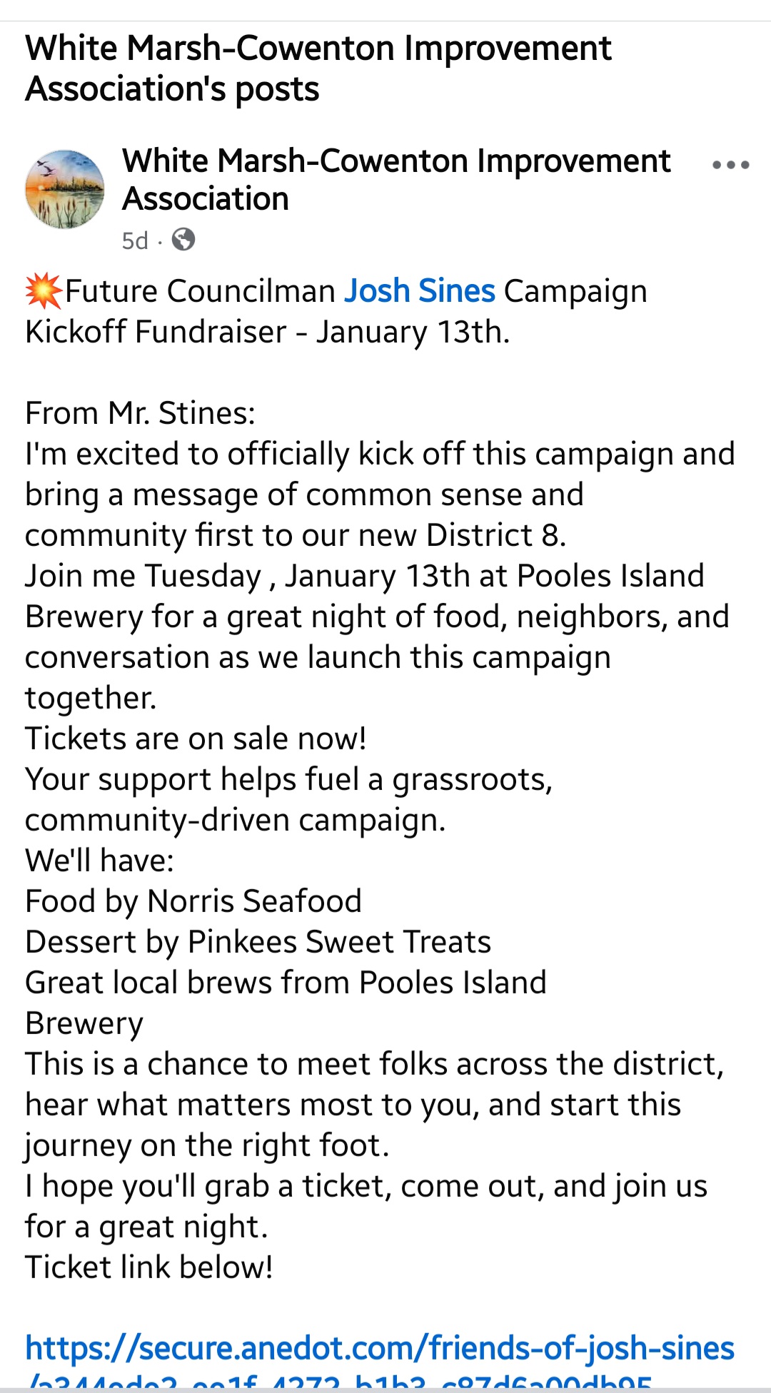 The White Marsh Cowenton Improvement Association shared a post of Sine’s upcoming campaign event.